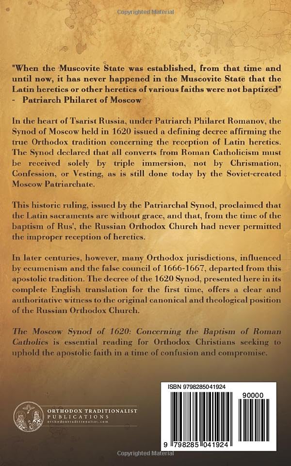 In later centuries, however, many Orthodox jurisdictions, influenced by ecumenism and the false council of 1666–1667, departed from this apostolic tradition. The decree of the 1620 Synod, presented here in its complete English translation for the first time, offers a clear and authoritative witness to the original canonical and theological position of the Russian Orthodox Church.
